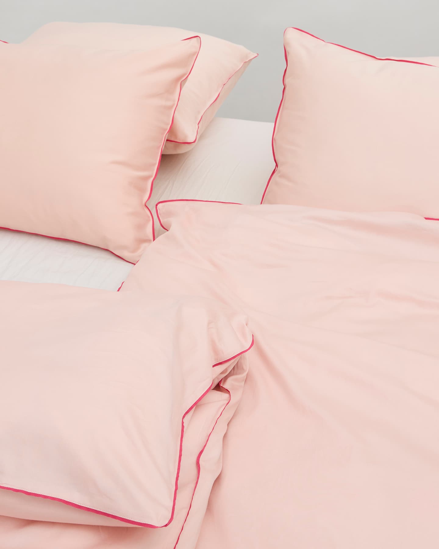 Strimma has a discrete, red piping on pillowcase, hand sewn by experienced sewers. The piping is made from recycled polyester.
