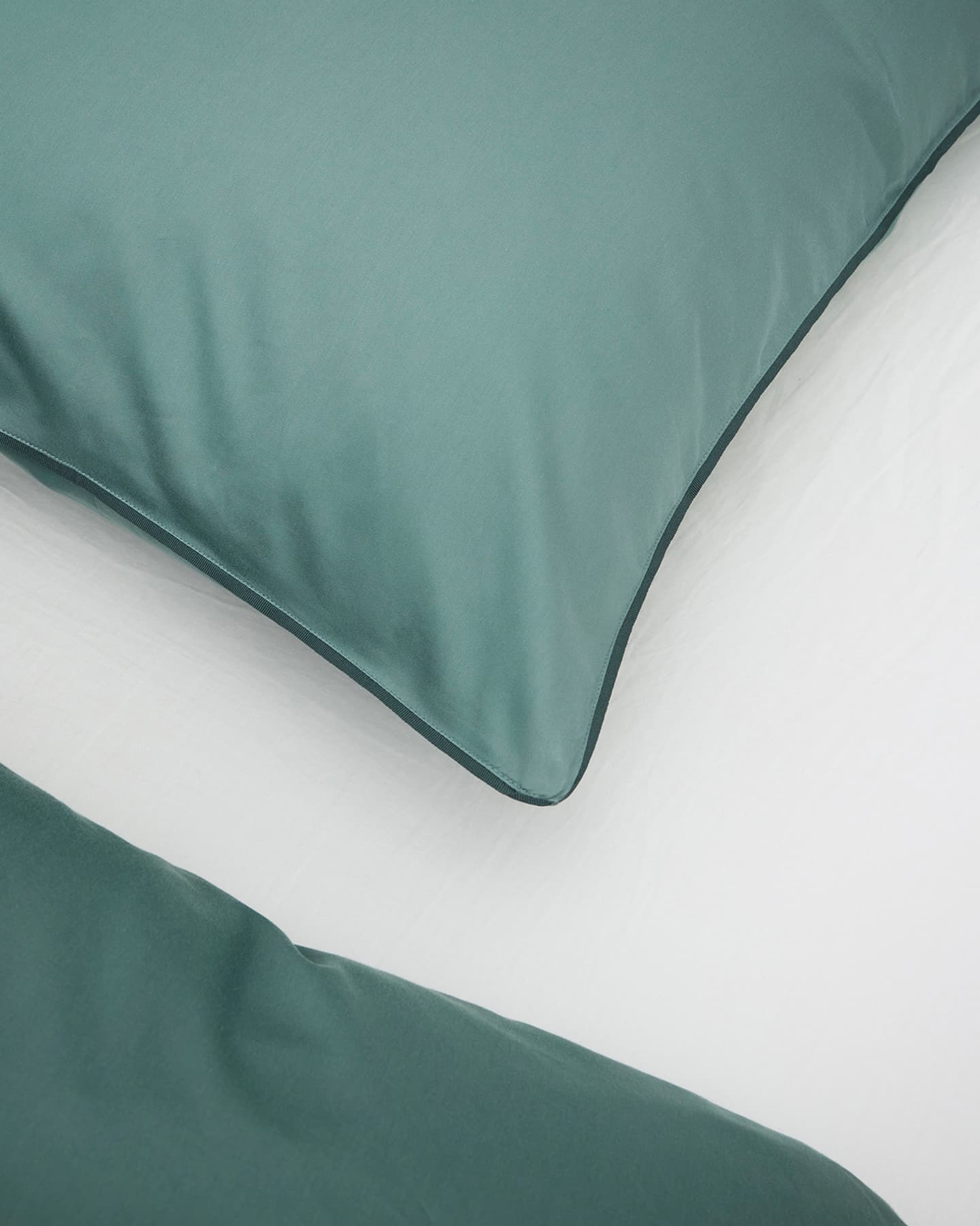 Strimma has a discrete, dark green piping on pillowcase, hand sewn by experienced sewers. The piping is made from recycled polyester.